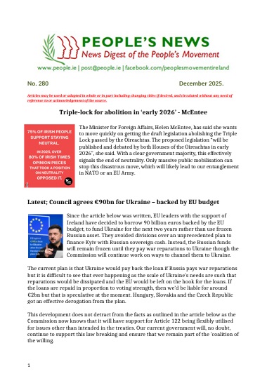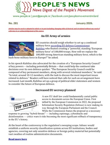 The People's Movement campaigns against any measures that further develop the EU into a federal super-state and works to defend and enhance popular sovereignty, democracy and social justice in Ireland.