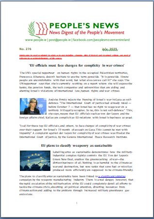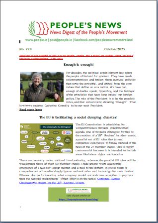 The People's Movement campaigns against any measures that further develop the EU into a federal super-state and works to defend and enhance popular sovereignty, democracy and social justice in Ireland.